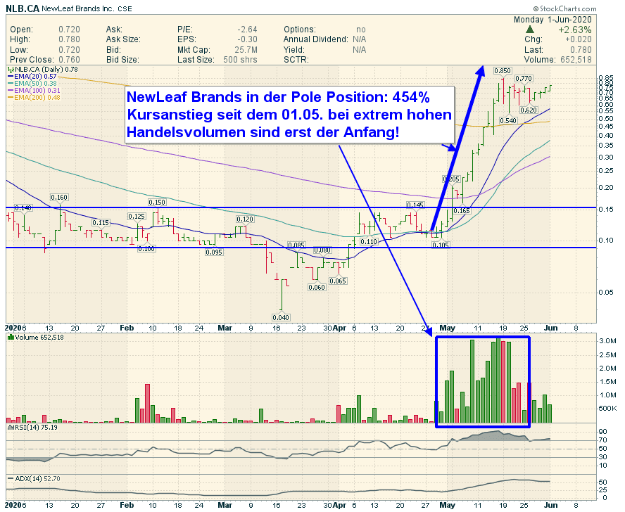 Wir können uns nur freuen und gebannt zusehen, wie die Aktie hier die letzten Wochen ein Feuerwerk nach dem anderen abbrennt! Die Nachfrage ist ungebrochen hoch und NewLeaf Brands (Ticker Kanada: NLB, WKN: A2PHGA) ist derart stark im Anstieg, dass selbst die vergangene, ruhige Woche ohne News, die Aktie steigen lässt! Das zeigt von brutaler Stärke!