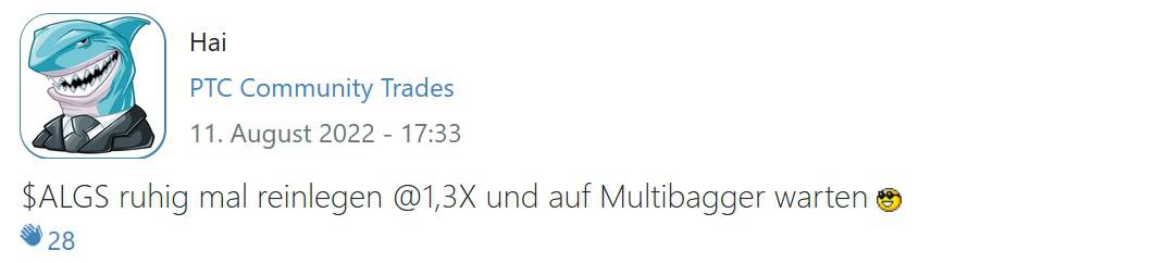 Der Titel bleibt angesichts geringerer Handelsumsätze und weniger augenscheinlicher Kurs-Katalysatoren zunächst langweiliger als Aligos, ist aber immer noch günstig. Gewinnmitnahmen schaden bei beiden Werten nicht.