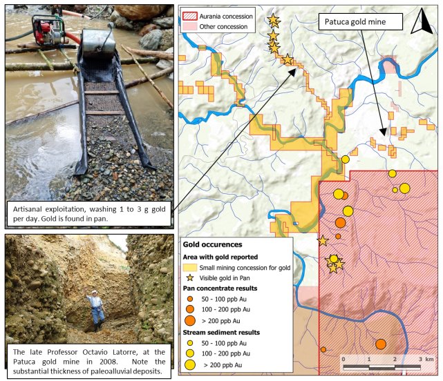 Figure 1: Gold results from the Aurania property near the artisanal Patuca Gold Mine.