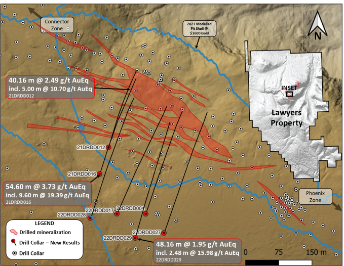 John Williamson, CEO, commented, “We are very pleased with these latest results from Dukes Ridge as we continue to expand on areas of known mineralization outside of the 2021 MRE pit shell. We anticipate continued growth for the Dukes Ridge deposit, and for the other deposit areas at Lawyers, as additional drill results contribute to the upcoming mineral resource estimate update.”