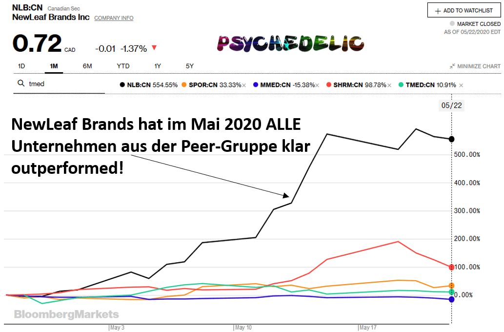 Bevor wir weiter unten im Artikel zur brandneu veröffentlichten Pressemeldung von unserem Psychedelika-Top Pick, NewLeaf Brands (Ticker Kanada: NLB, WKN: A2PHGA) kommen, werfen wir zunächst einen Blick auf die gewaltige Performance der Aktie im laufenden Monat Mai!