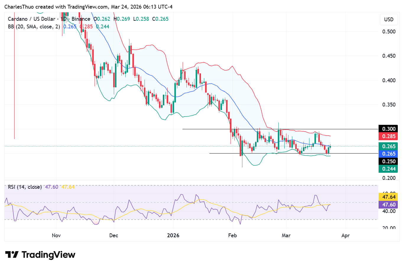 Auf den Charts konsolidiert ADA zwischen $0.24 und $0.29 und bildet eine Spanne, die sowohl Kaufinteresse als auch anhaltenden Verkaufsdruck sichtbar macht.