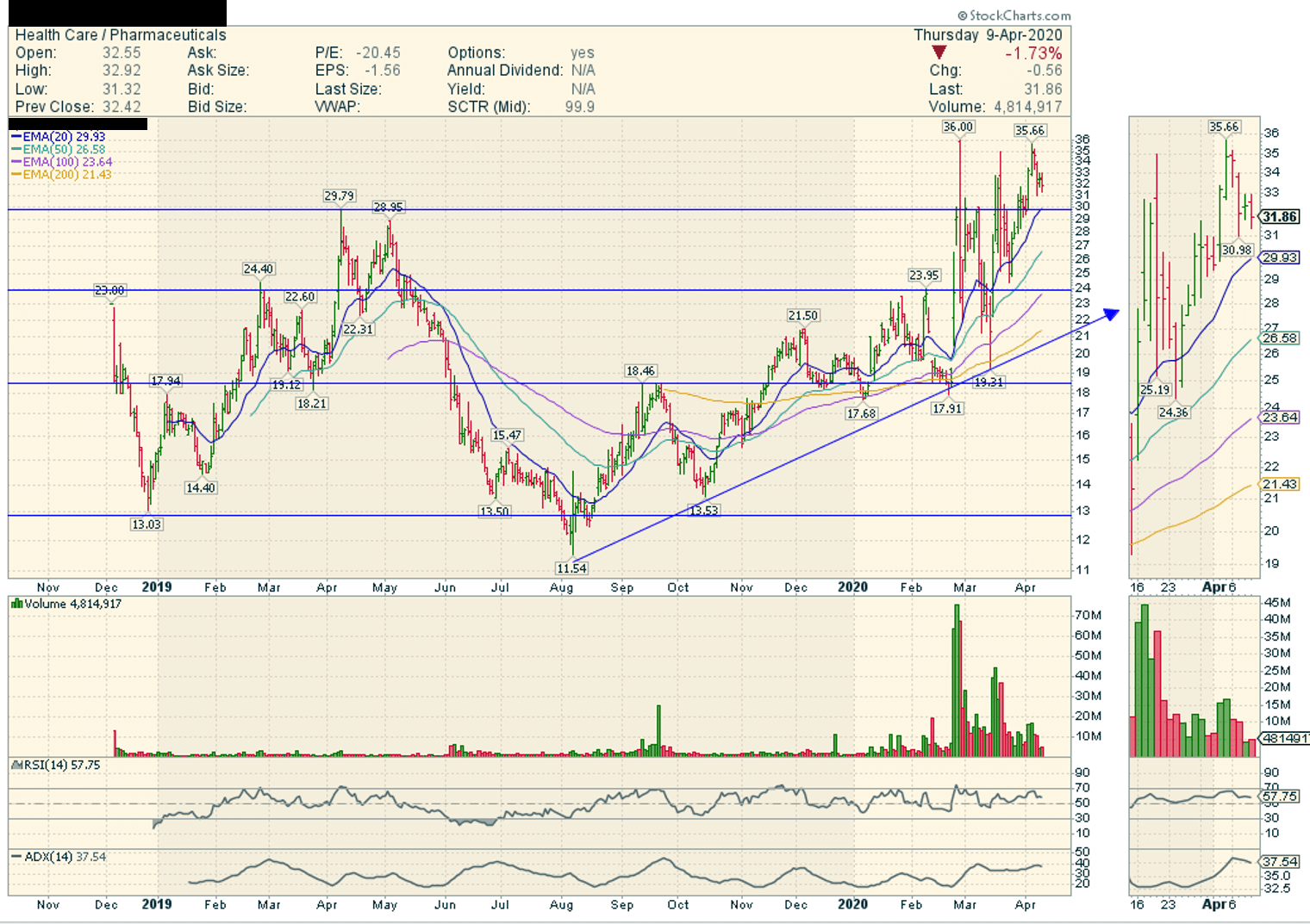 Auch unsere zweiter Biotechfavorit hat in den letzten Monaten eine sagenhafte Performance abgeliefert. Die Aktie konnte von einem Tief im August 2019 bei 11,54 USD in der Spitze bis auf 36 USD anziehen. Erste Kauftranchen bei 30 und dann etwas tiefer bei 24 USD dürften spannende Einstiegsmarken sein.