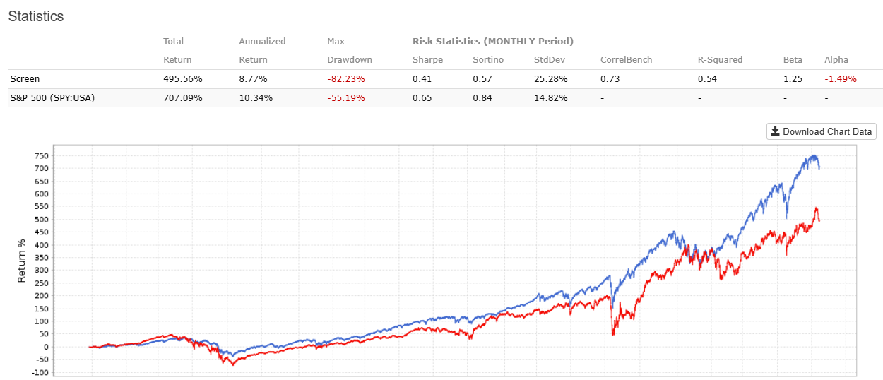Unser Versuch, in die Aktien mit der höchsten Dividendenrendite im S&P 500 zu investieren scheitert. Wir sehen in dieser und den folgenden Grafiken zwei farbige Kurven. Die blaue Kurve ist der Gesamtmarkt zum Vergleich. Hier natürlich der S&P 500. Die rote Kurve zeigt die Entwicklung unserer Kapitalkurve, wenn wir in den letzten 20 Jahren alle 4 Wochen jeweils die 20 Aktien mit der höchsten Dividendenrendite gekauft hätten.