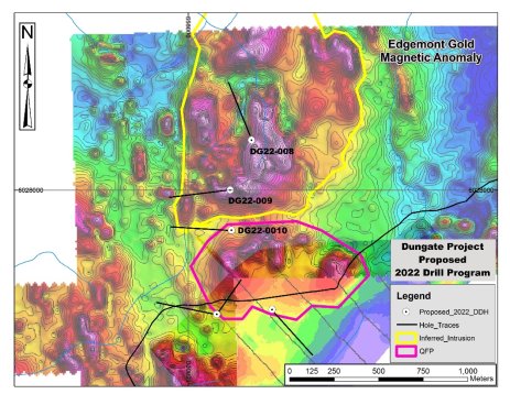 The third hole (“DG22-10”) is currently being drilled to follow up on significant intervals of anomalous gold, including 27 m @ 0.44 g/t Au, identified at the bottom of hole DG21-04 in 2021 within the gold shell along the edges of the QFP intrusive that was the focus of drilling in 2021. Drill hole DG22-10 has been collared on the drill pad for DG21-04 and is being drilled to test a depressed magnetic signature on the edge of the QFP that appears to coincide with the gold zones. The location and trace of Hole DG22-10 is indicated on the 2022 drill hole location map above.