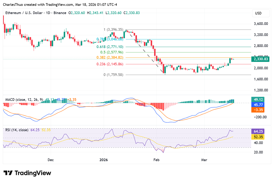 Diese Zone fungierte als starker Widerstand und entspricht dem 38,2%‑Fibonacci‑Retracement‑Niveau, nachdem die Kryptowährung von ihren Januarkursen auf ein Tief von rund $1.758 im Februar gefallen war.