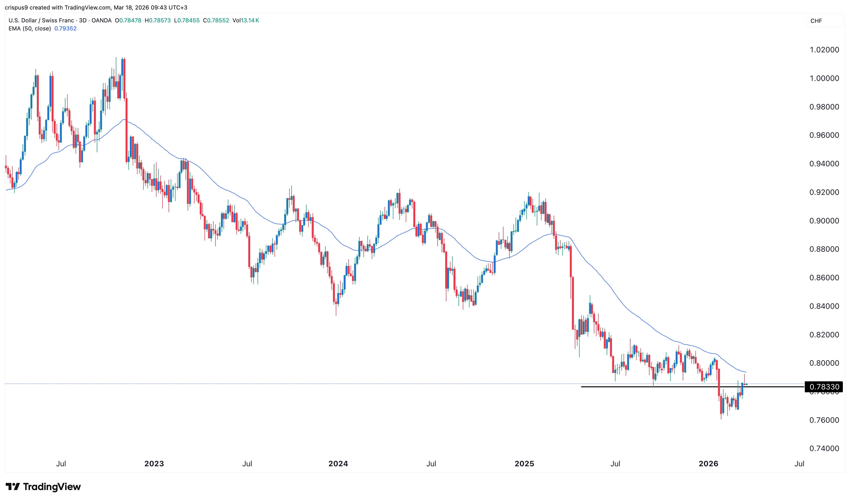 Der Dreitages-Chart zeigt, dass das Paar USD/CHF weiterhin in einem Bärenmarkt liegt und sich nahe seinem Jahrestief bewegt. Es notiert bei 0.7833, leicht über dem Jahres-Tief von 0.7600.