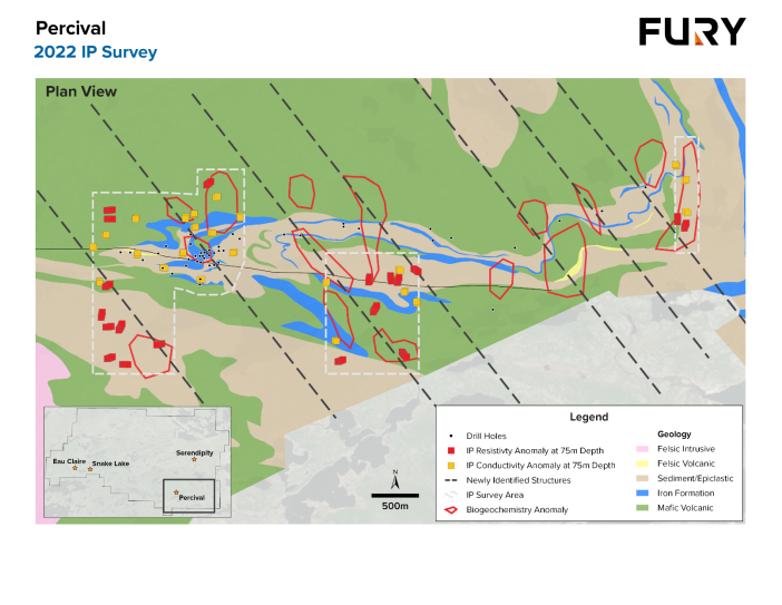 We are excited to have been able to better fingerprint the Percival mineralization through IP geophysics and to be able to refine our targeting ahead of the upcoming drilling campaign. Additionally, new target styles are becoming apparent outside of the Percival stratigraphy where we have IP conductivity and resistivity anomalies paired with biogeochemical anomalies along a previously unrecognized structural trend,” stated Bryan Atkinson, SVP Exploration of Fury.