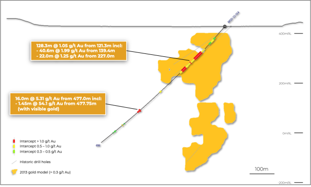 These results are similar to those intersected in the historic hole, which returned 136.0m at 1.09 g/t Au from 137.0m.