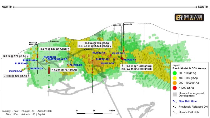GR Silver Mining Chairman and CEO, Eric Zaunscherb commented, “The 2022 infill drill program at the Plomosas Mine has been carefully designed to address upside potential in the resource block model. It has been our thesis that historical sampling lacked detail in some unmined areas resulting in the adoption of zero grade in unsampled drill hole intervals in the current resource model. This is supported by the observation that current resource model grades in areas already mined are lower than suggested by historical production grades. Further, it is very encouraging to see such high–grade Ag results confirming the existence of new, high-grade Ag zones associated with previously ignored cross-cutting structures. It is highly satisfying to see further proof of concept on both themes, with the potential for a commensurate re-rating.”