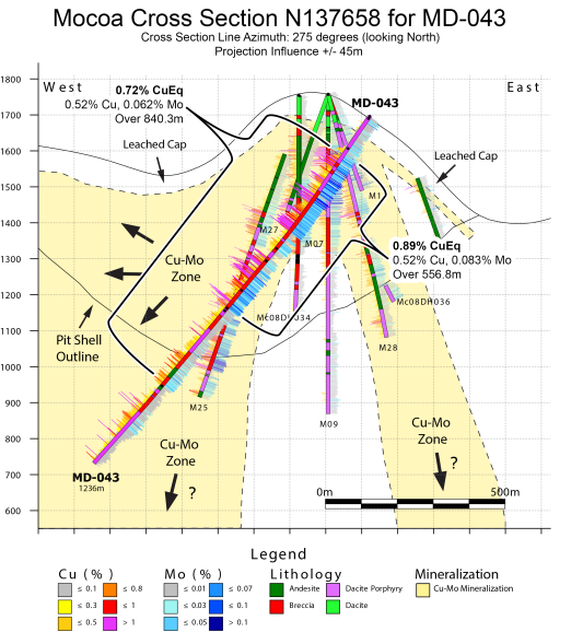Copper and molybdenum grades are illustrated as histograms on the cross section illustrated in Figure 1, and Photos 1, 2 and 3 are presented as representations of mineralization intersected at 489.5 metres, 510 metres and 877 meters respectively.   Figure 1 is a cross section through hole MD-043 oriented 275 degrees looking north with a projection influence of +/- 45 metres.  Simplified lithologies are plotted down the hole trace with copper and molybdenum histograms plotted along the left and right side of the hole trace respectively. An interpretation of the mineralized copper-molybdenum zone is illustrated, and the projected pit shell is illustrated as defined in the November 1, 2021 NI 43-101 Technical Report2.  Table 2 contains select composite samples for the drill holes within the cross section. Table 3 contains the coordinates for drill hole MD-043
