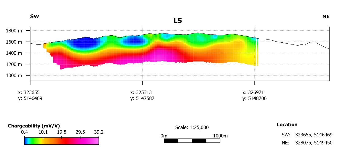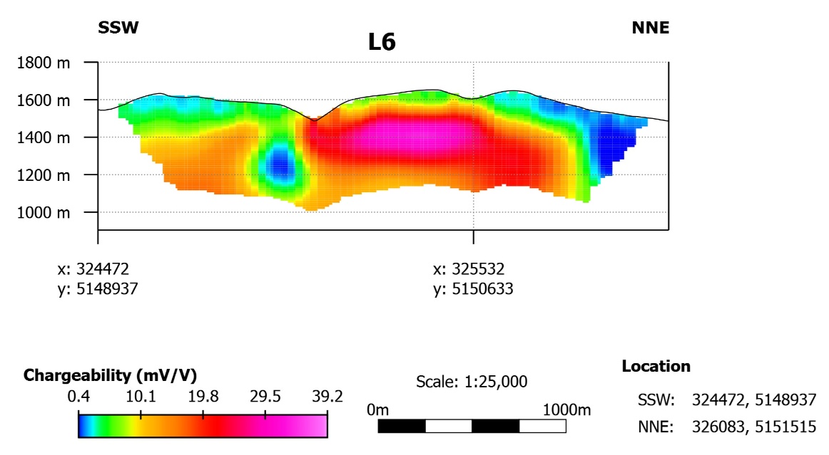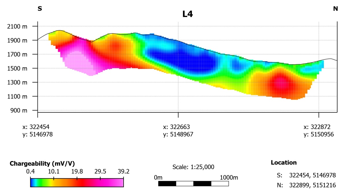 Die geophysikalischen IP-Untersuchungen 2026 beinhalten eine einzelne Linie (Linie 6) etwa 350 m westlich der historischen Daten, die Rio Tinto im Jahr 2021 erhoben hat. Diese Linie verdeutlicht, dass sich das Aufladbarkeitsmerkmal weiter in Richtung Westen erstreckt als bisher bekannt war, und stellt ein vorrangiges Bohrziel mit Potenzial für eine Porphyrkupfermineralisierung dar (Abbildungen 2A, 2B und 3).