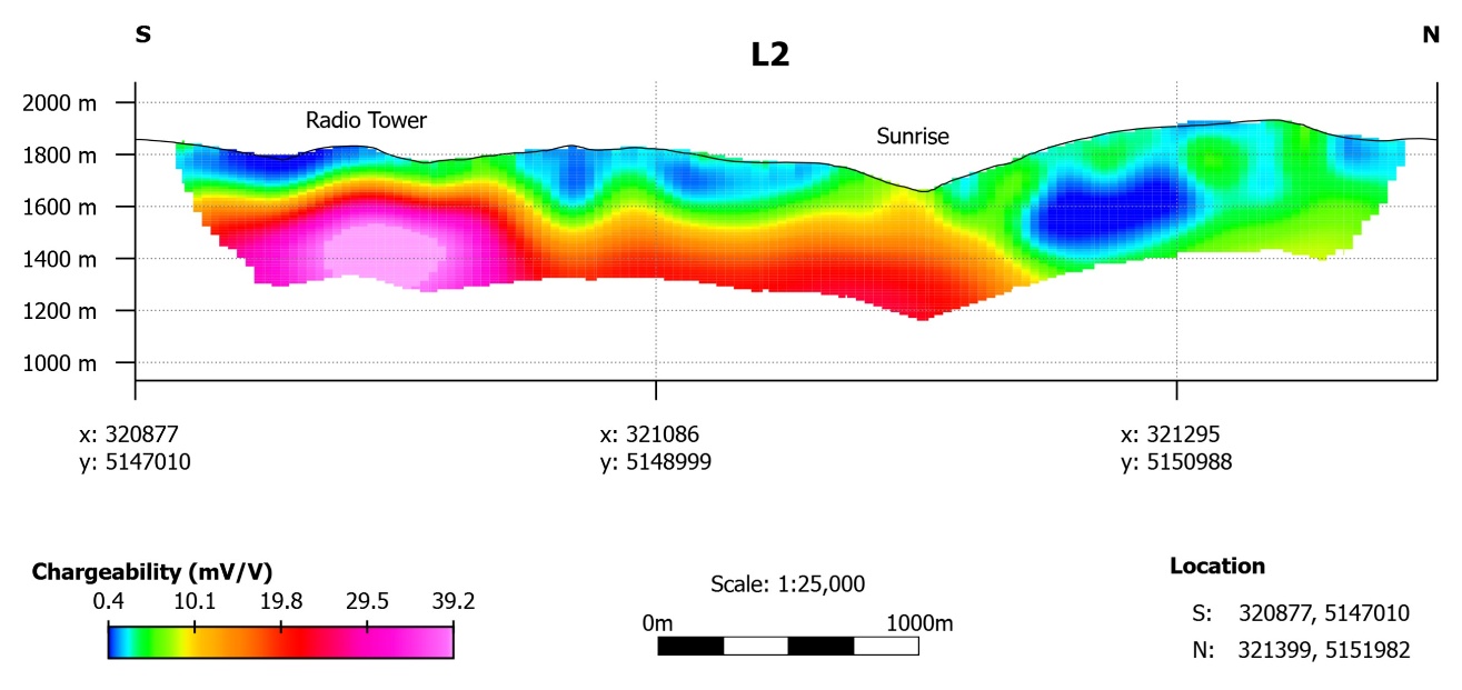 Die geophysikalischen IP-Untersuchungen 2026 umfassten vier nordnordöstlich ausgerichtete Linien im und im Umfeld des Ziels Sunrise, die nördlich von Sunrise ein interessantes Aufladbarkeitsmerkmal verdeutlichen und zudem ein Aufladbarkeitsmerkmal südlich der Mine Sunrise abgrenzen. Die südliche Anomalie setzt sich in Richtung Süden bis zum Zielgebiet Radio Tower fort (Abbildungen 2A, 2B und 5). Diese Struktur unmittelbar südlich der Mine Sunrise stellt für Domestic Metals ein vorrangiges Bohrziel dar, das das Potenzial für eine Kupferporphyr- und Skarnmineralisierung aufweist (die Struktur ganz rechts auf Linie 2, dargestellt in Abbildung 5).