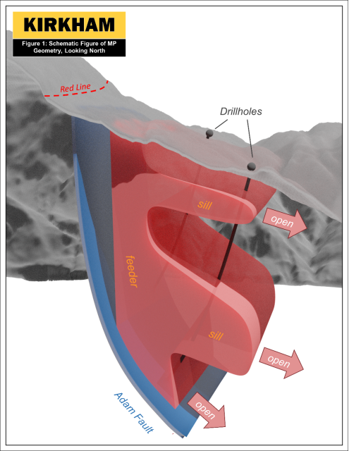 1. A deeper sill tracked over 720 m from North to South, that pinches (>40 m) and swells (<170 m) along its length and is still open to the North (beyond KH21-42), South (beyond KH20-36), and to the East.