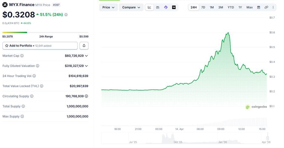 Die Kryptowährung MYX Finance (MYX) erlebte einen jener Tage, die im Krypto-Markt sofort Aufmerksamkeit erregen. Der Token stieg kräftig an und berührte kurzfristig ein Hoch von $0.599, bevor er wieder auf rund $0.3208 zurückfiel.