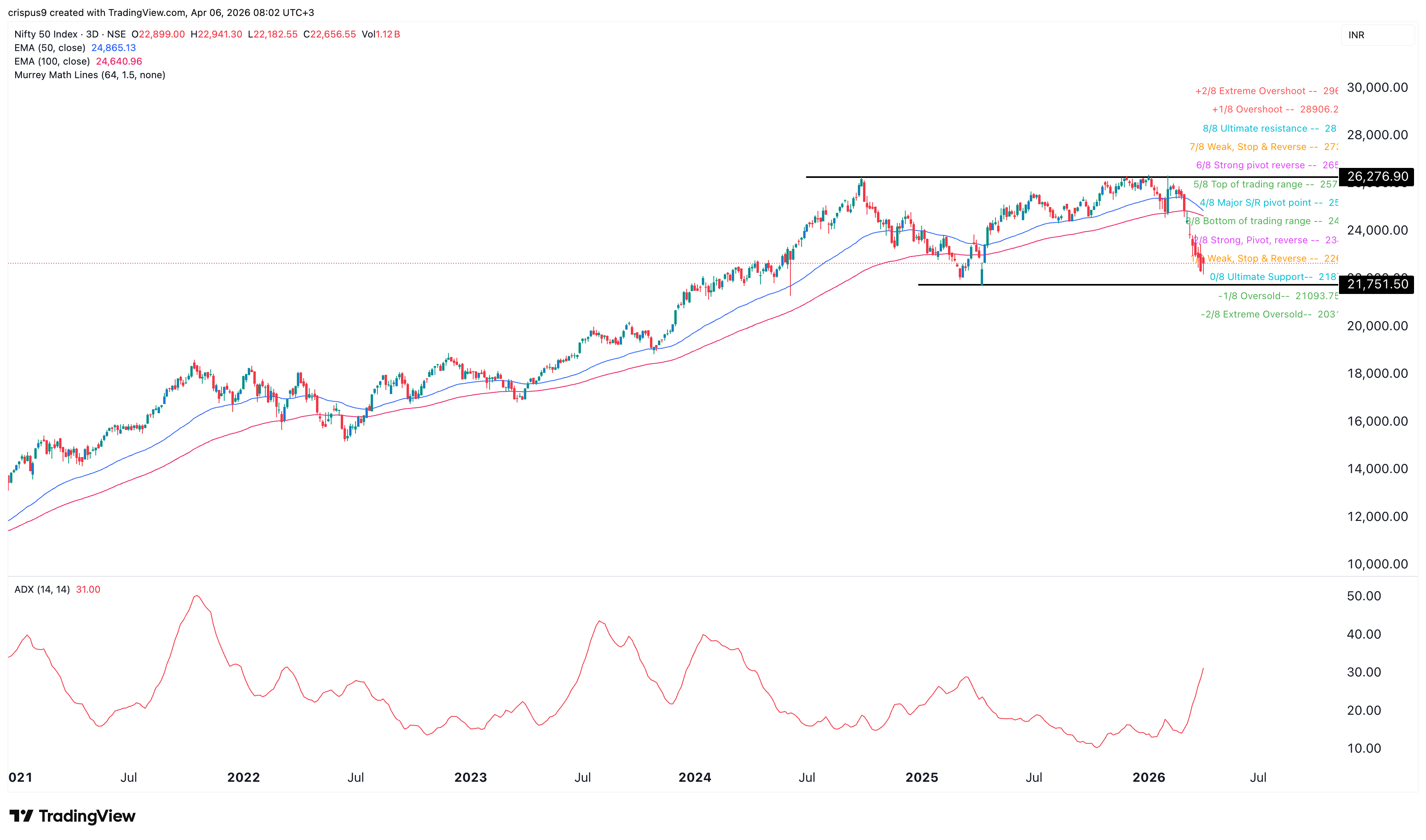 Der Nifty 50 Index blieb am Montag in einer Korrektur, da die Risiken für die indische Wirtschaft anhielten. Er fiel auf INR 22.678, fast 14 % unter dem Höchststand dieses Jahres, und die technischen Indikatoren deuten darauf hin, dass kurzfristig weiterer Abwärtsdruck zu erwarten ist, solange der Krieg mit Iran und die Bankenkrise andauern.