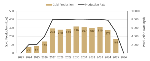 - Peak production of 316,000 ounces and average of 297,000 ounces when operating at 8,000tpd