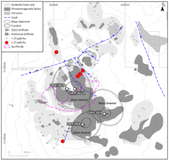 Four (out of a planned five) diamond drill holes totaling 1,020 meters were completed at Rosario del Alto in the north of the property, targeting three main phreatomagmatic complexes (Maar Austral, Maar Central, Maar Oriental) identified by geological mapping (see map below). All drill holes cut large columns of phreatomagmatic rocks, confirming a high degree of preservation and continuity of the systems at depth. No significant precious metals intervals were intercepted to date, but partial results from multi-element geochemical analyses show strong pathfinder anomalies, consistent with surface geochemical anomalies. The phreatomagmatic facies show a progression from polymictic crater-fill environments in the centers of the diatremes and at depth, towards monomictic environments at the edges of the complexes. Surficial tuffaceous maar sediments also occur.