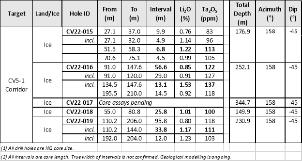 Assays are announced herein for drill holes CV22-015, 016, 018, and 019, which were designed to test the northeastern and down–dip extension of the lithium-tantalum mineralized zone at the CV5 Pegmatite. All four holes were collared over lake ice at an orientation of 158°/45°, with end-of-hole depths ranging from 149.9 m to 252.1 m, and each returning strong grades of lithium and tantalum. A summary of lithium (and tantalum) intercepts for the four (4) drill holes (CV22‑15, 016, 018, and 019) are presented in Table 1 and Figure 2, and core photos of mineralized intercepts in Figures 3, 4, and 5. Drill hole locations for holes completed as part of the winter program are in Figure 1.