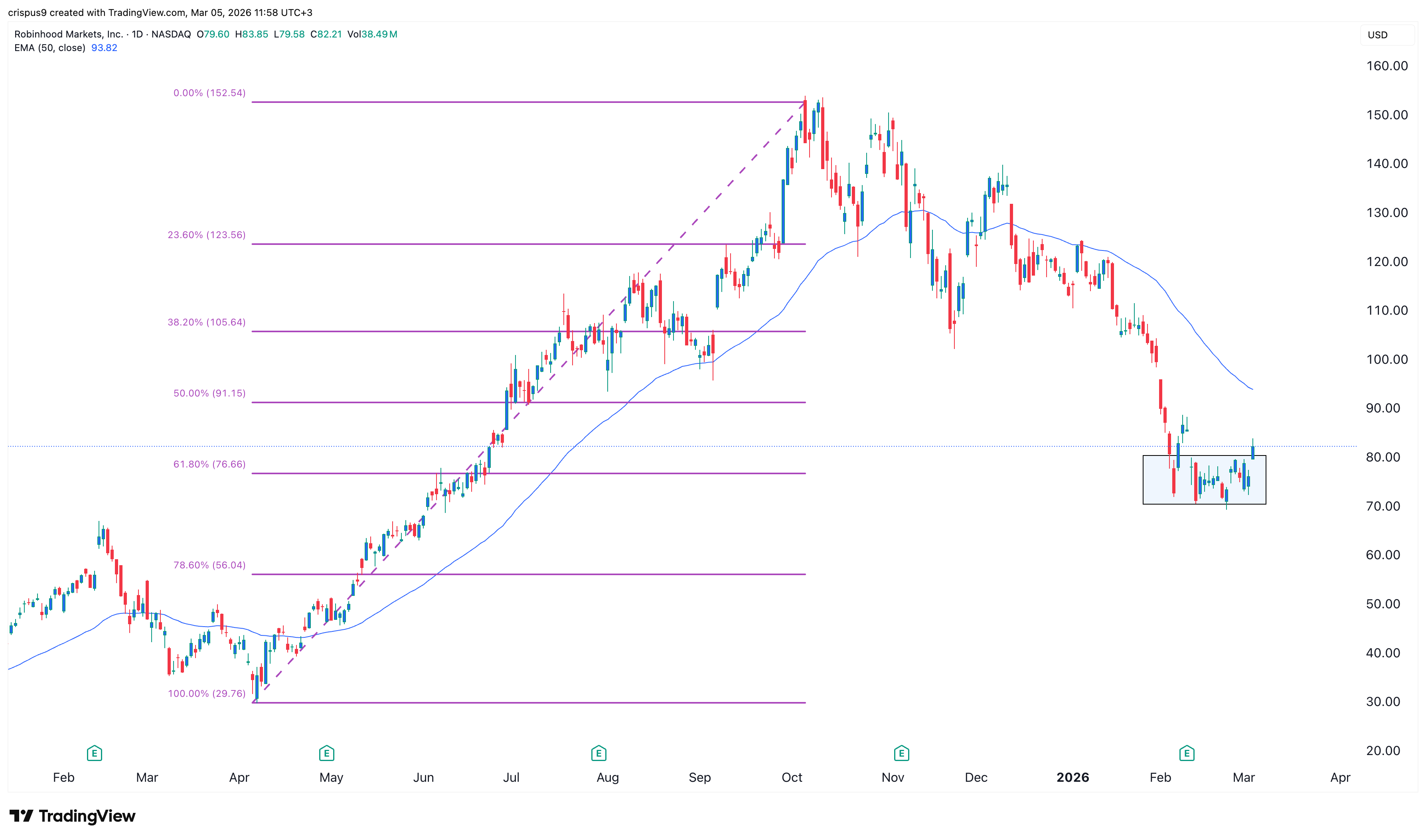 Das Tages-Chart zeigt, dass der HOOD-Aktienkurs in den vergangenen Monaten unter Druck geblieben ist. Er fiel von einem Hoch von $152 im October letzten Jahres auf aktuell $82.