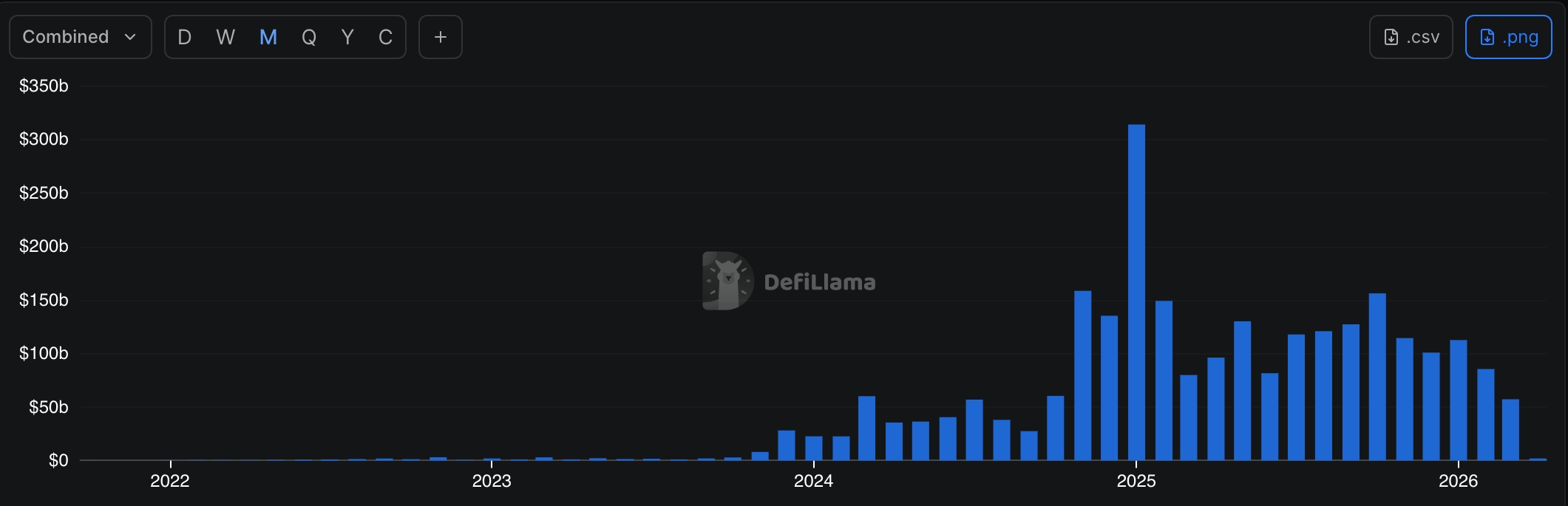 Ein gutes Beispiel dafür ist der Bereich der dezentralen Börsen (DEX), wo das Volumen im März auf $57 Mrd. sank – den niedrigsten Stand seit Monaten. Im Januar des Vorjahres lag es noch bei über $313 Mrd.