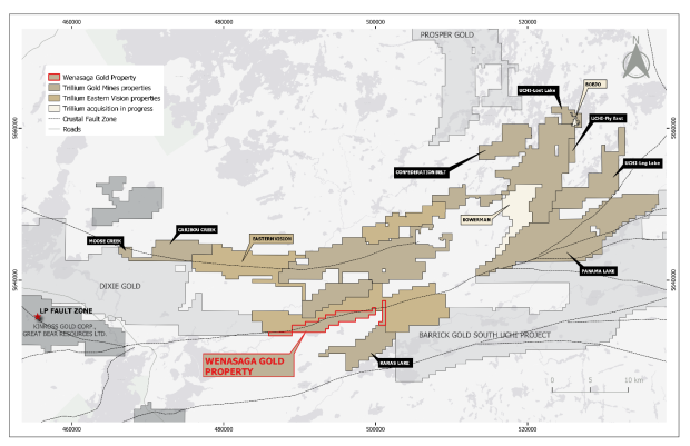 Vancouver, BC, Canada – June 2, 2022 – Trillium Gold Mines Inc. (TSXV:TGM, OTCQX:TGLDF, FRA:0702) (“Trillium Gold” or the “Company” – https://www.commodity-tv.com/ondemand/companies/profil/trillium-gold-mines-inc/) is pleased to announce that it has signed the Wenasaga Property Option Agreement (the “Agreement”) to acquire a 100% undivided interest in the Wenasaga Gold Property (the “Property”) held by Bounty Gold Corp. (“Bounty Gold”). The 1,692 hectare Property is contiguous to Trillium Gold’s Eastern Vision land package and effectively extends Trillium Gold’s dominant foothold along the Confederation belt on trend with Kinross Gold’s LP Fault Zone of the Dixie Deposit (see Figure 1).