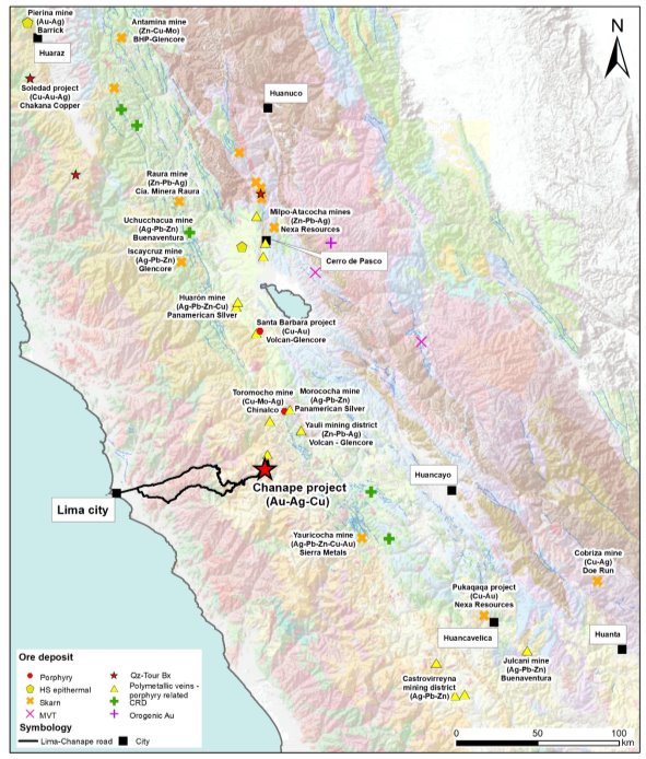 Figure 1 – Project Location: The Chanape Project is located ~140 km by road from Lima, the capital of Peru. The Project is located within a strongly-mineralised belt with several operating mines.