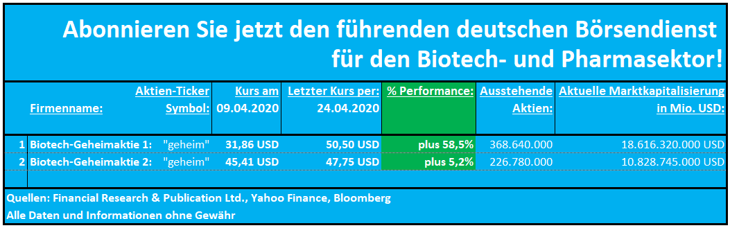 Verpassen Sie also nicht den nächsten Biotech-Highflyer! Unsere nächste exklusive Unternehmensvorstellung ist bereits in Vorbereitung! Melden Sie sich jetzt zum kostenlosen Newsletter an und erhalten Sie unseren neuen COIVD19-Report!