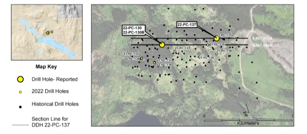 Hole 22-PC-137 successfully extended mineralization encountered in 21-PC-135 over 125 metres toward to the northeast and mineralization in these two holes remains open at depth (Fig.1; Fig. 2). It is encouraging that copper grades in PC-68 and PC-42 increase over their lower portions as shown in Figure 2 – Section 5987075N, where they cut the top of a northeast plunging zone of mineralization.