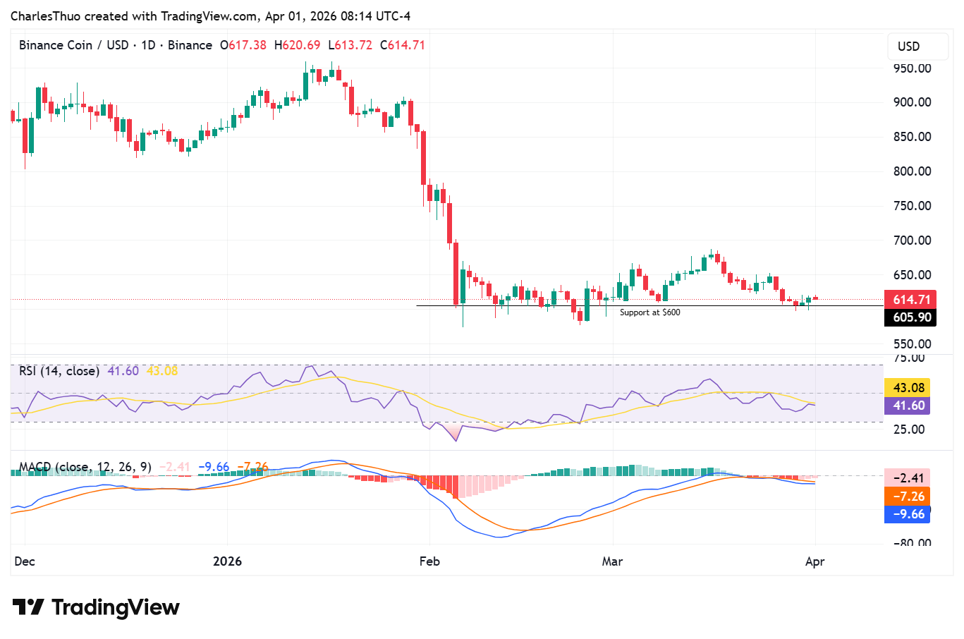 Auf der Unterseite hält BNB eine wichtige Unterstützung bei rund $600, die sich in den vergangenen Sitzungen als stabil erwiesen hat.