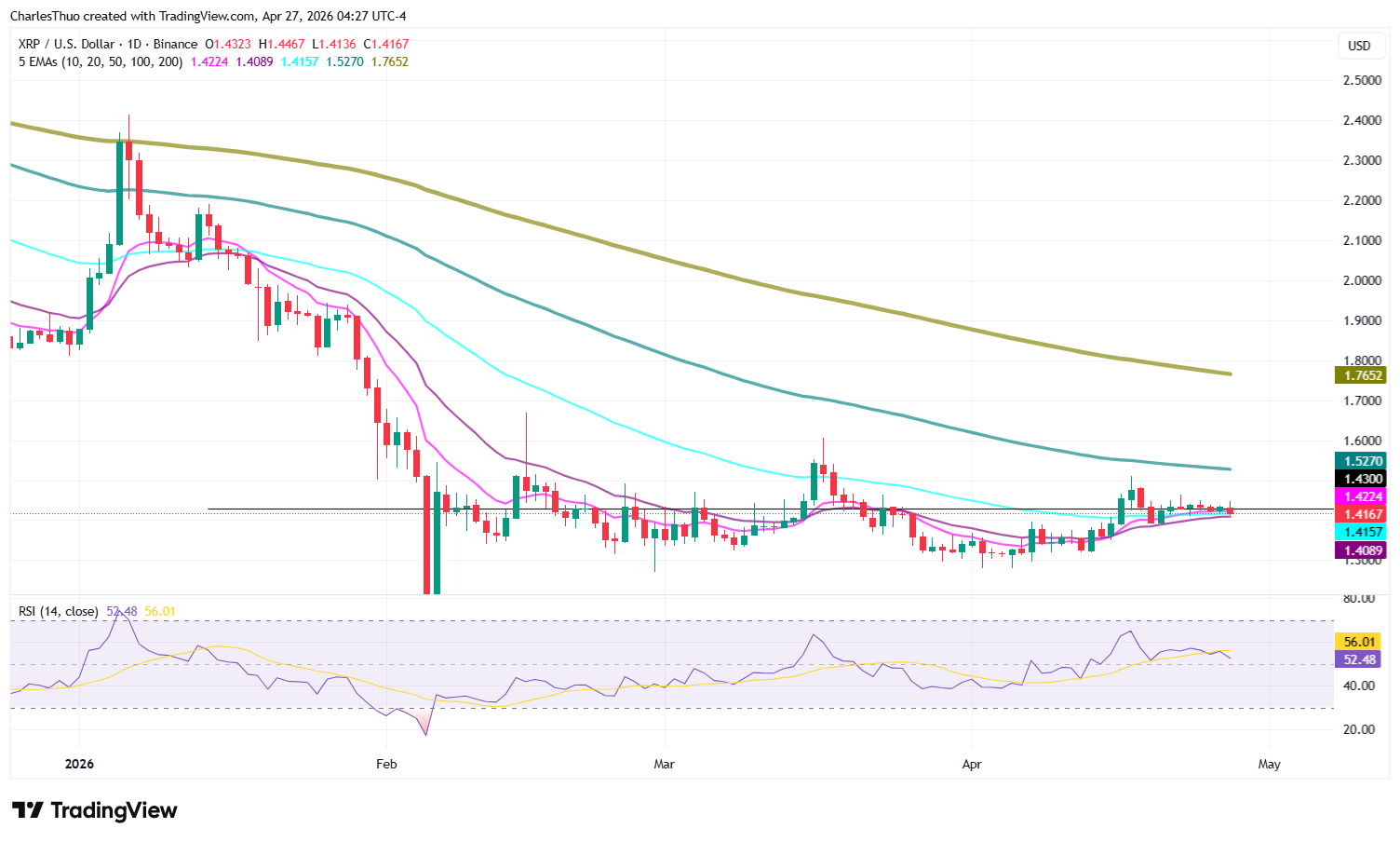 Während einige Projektionen in künftigen Zyklen höhere Werte vorsehen, bleibt die aktuelle Kursbewegung eindeutig konsolidierend. Die Richtung des nächsten Ausbruchs hängt davon ab, ob Käufer den Widerstand bei $1.43 zurückerobern können oder Verkäufer einen Durchbruch unter $1.40 erzwingen.