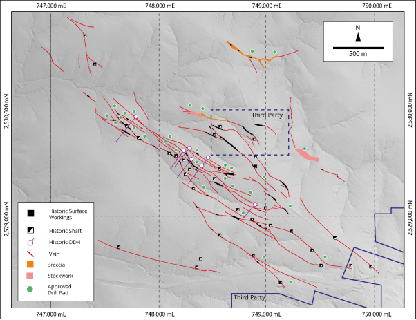 Historically the El Cristo vein system has only been tested by 8 angled diamond drill holes, despite comprising multiple veins within a zone of dilation that is 4 km long and up to 600 m wide. Moreover, these holes targeted the vein at depths of below 100 to 200 metres. There are over 20 known historical near surface shafts and multiple areas with near surface historical workings.